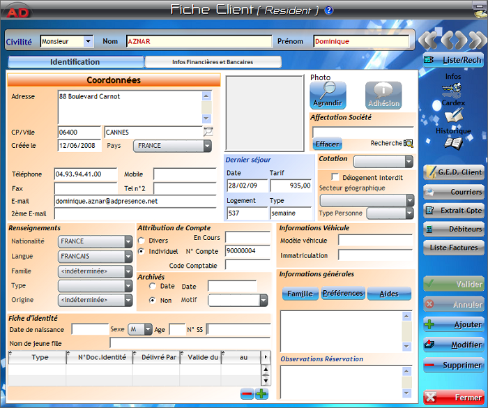 Fiche client Logiciel Palace